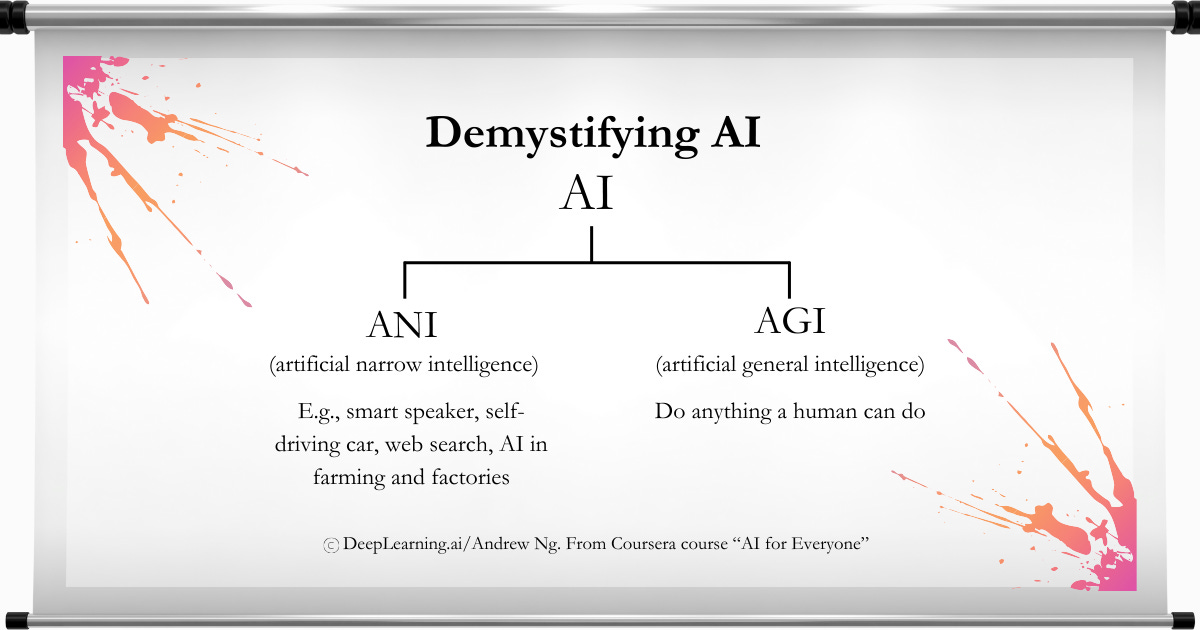 Andrew Ng, of DeepLearning.ai, presents this AI description under the title, “Demystifying AI” in an introductory Coursera course called “AI for Everyone.”