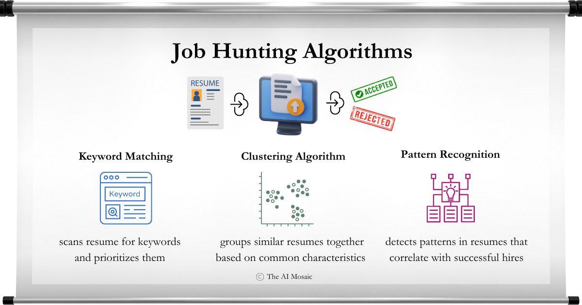 When job hunting, we tweak our applications to outsmart the algorithm and reach a human. Unfortunately, it’s not always straightforward to trick the algorithms with so many at play in the background. The graphic below highlights just three of the algorithms used in a job search platform: keyword matching, clustering, and pattern recognition.