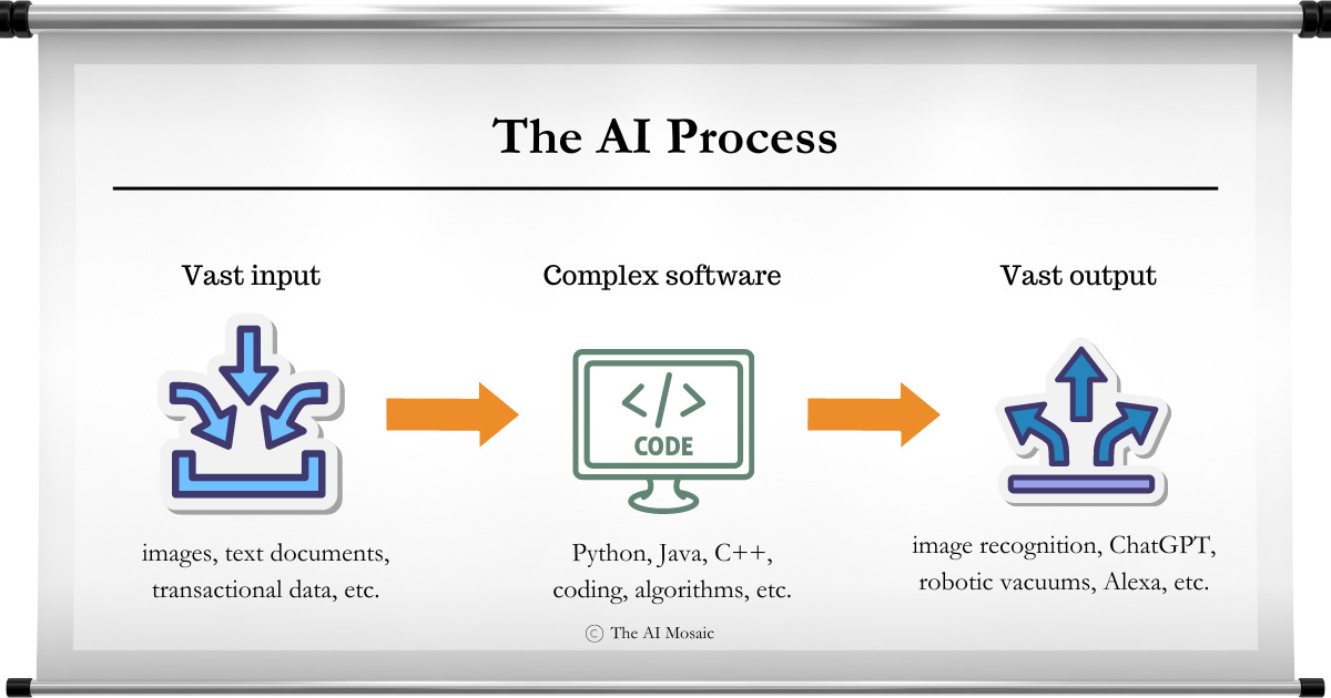 AI's complex software consists of extensive computer code, mathematical models, and vast information sources known as data or input. Essentially, we can think of AI as a series of steps: input → computer programming → output, as shown in the graphic below. AI software, though, is unique in each of these steps. The input is vast, the programming can self-teach, and the output is intelligible.