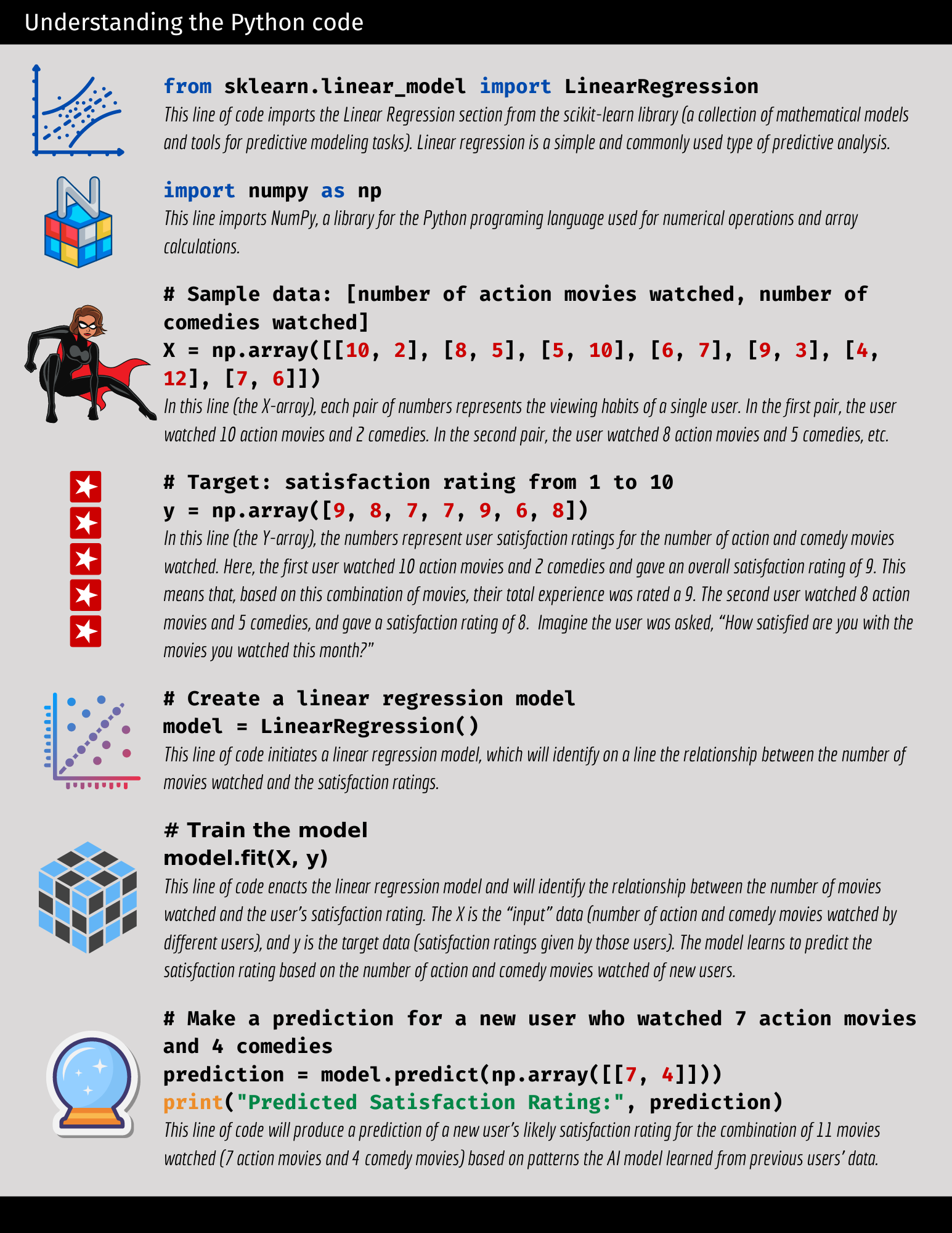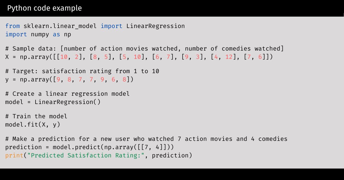 The image below displays a mock Python code example that uses AI to predict movie satisfaction. It also includes a linear regression algorithm. Imagine that this sample code is for an application that predicts viewer satisfaction with the movies they watched over the previous month.